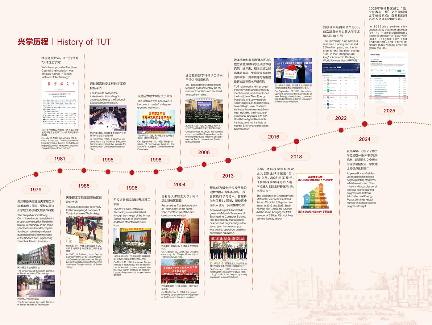 Formerly known as Tianjin Institute of Technology, the university's history dates back to 1979, when it began admitting undergraduate students as the Science and Engineering Branch of Tianjin University. Tianjin Institute of Technology was officially established in 1981 with the approval of the State Council. In 1996, the former Tianjin Institute of Technology merged with three undergraduate institutions—the Tianjin University Branch Campus, the Tianjin University Mechanical and Electrical Branch Campus, and the Tianjin University Metallurgy Branch Campus—to form the new Tianjin Institute of Technology. With the approval of the Ministry of Education, it was renamed Tianjin University of Technology in 2004.