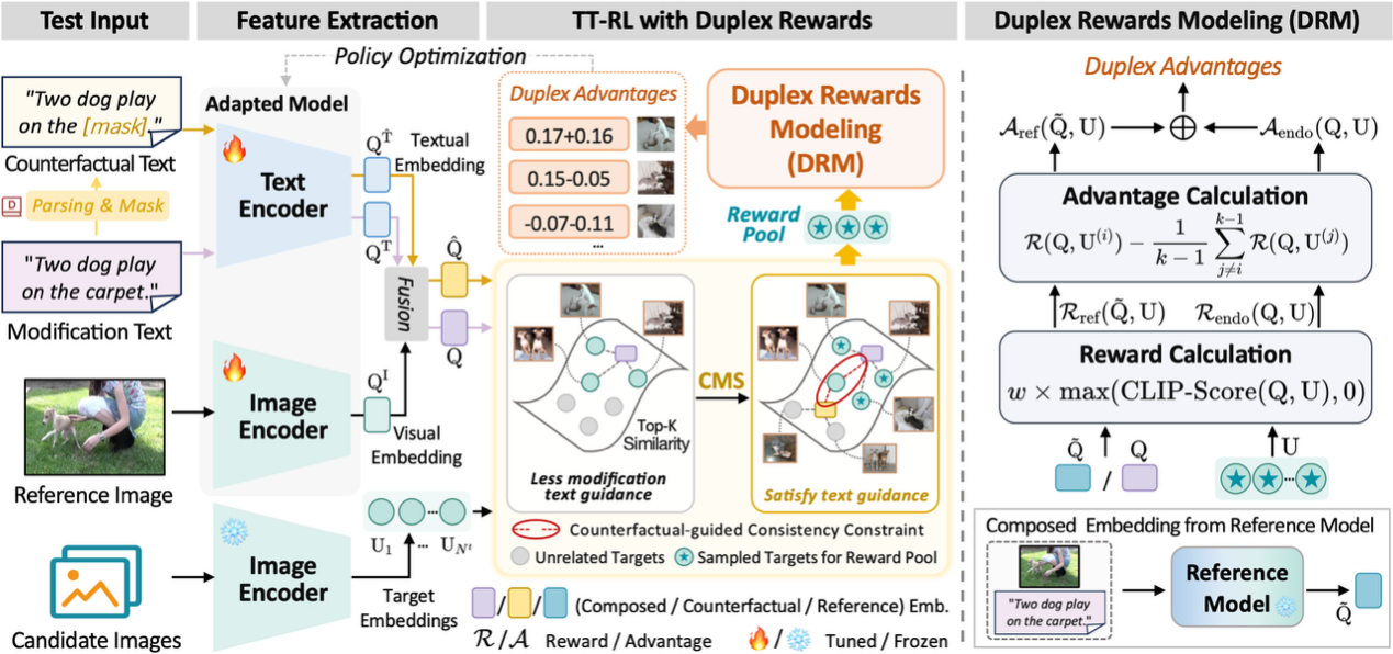 Summary:Composed Image Retrieval (CIR) aims to retrieve a target image by combining a reference image with a modifying text description. In recent years, Zero-Shot CIR has gained increasing attention because it avoids the need for manually annotated triplet data. However, this paradigm inevitably requires additional training corpora, storage and computational resources, which limits its practicality. Inspired by advances in Test-Time Adaptation (TTA), this study introduces a Test-Time CIR (TT-CIR) paradigm that enables models to effectively adapt to and accurately retrieve test samples while reducing computational overhead.The study identifies two key limitations in current reward-based TTA approaches:1)Restricted reward pools, which hinder exploration of semantically relevant candidate rewards;2)Conservative knowledge feedback, which suppresses the adaptability of reward signals to the test-time data distribution.