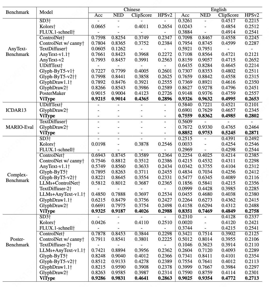 To address these issues, the paper introduces ViType, a glyph-aware multimodal diffusion framework. It is the first to incorporate a VQA-style glyph–text alignment mechanism into diffusion models. With a three-stage “recognize–render–refine” training strategy, ViType enables diffusion models to render arbitrary text in a high-fidelity, multilingual and stylized manner, achieving new state-of-the-art results across five major benchmarks.The primary innovations of ViType include: 1) Text–glyph alignment: A VQA-inspired mechanism aligns character images with their attribute descriptions within the embedding space, enhancing the model’s ability to capture glyph-level visual characteristics. 2) Multimodal joint rendering: Using the MMDiT architecture, ViType jointly fuses glyph visual embeddings with semantic text tokens, ensuring cross-modal consistency and producing structurally accurate, stylistically coherent text rendering. 3) Aesthetic-enhanced training: A large-scale, multi-source dataset of over 20 million high-quality text–image pairs is constructed to improve text–background integration, significantly enhancing the overall visual aesthetics and layout quality of the generated images.