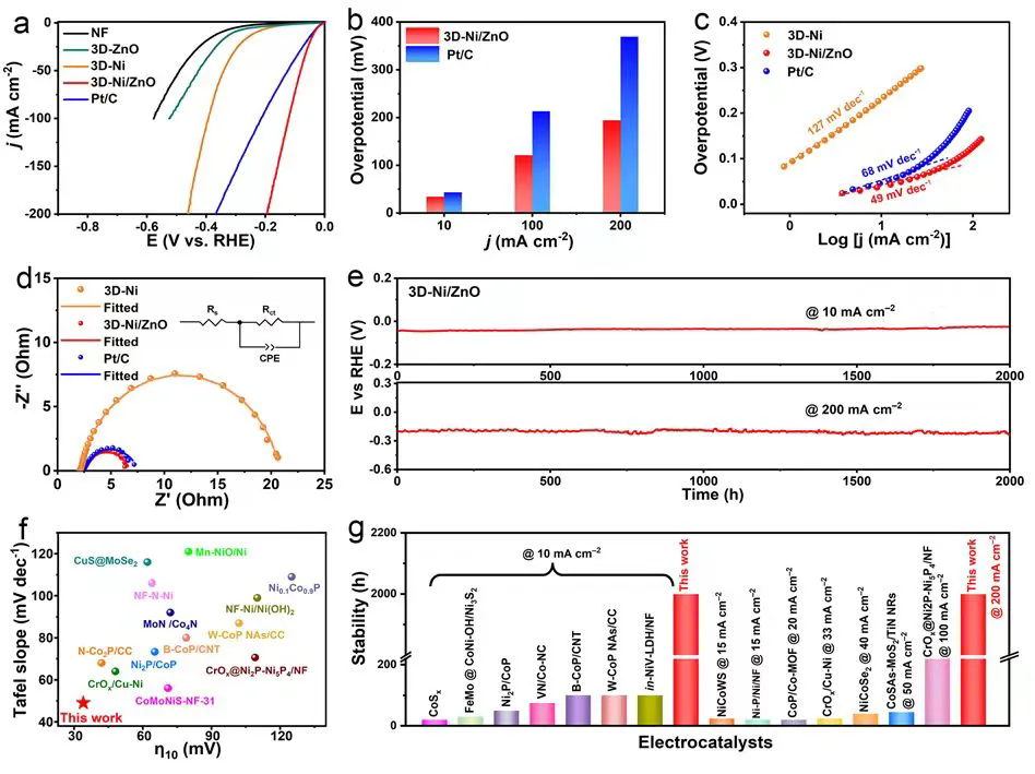 HER performance tests showed that the 3D-Ni/ZnO catalyst exhibited excellent HER activity, requiring overpotentials of only 34, 121, and 194 mV to achieve current densities of 10, 100, and 200 mA cm⁻², respectively, significantly surpassing the Pt/C catalyst. Tafel slope analysis indicated that the HER mechanism for 3D-Ni/ZnO shifted from the Volmer-controlled step observed for the Ni catalyst to the more efficient Volmer-Heyrovsky mechanism. Furthermore, 3D-Ni/ZnO demonstrated outstanding durability, operating stably for over 2000 h at current densities of 10 and 200 mA cm⁻2. Overall, the developed 3D-Ni/ZnO catalyst exhibits superior activity and stability compared to most neutral HER catalysts reported in the literature.