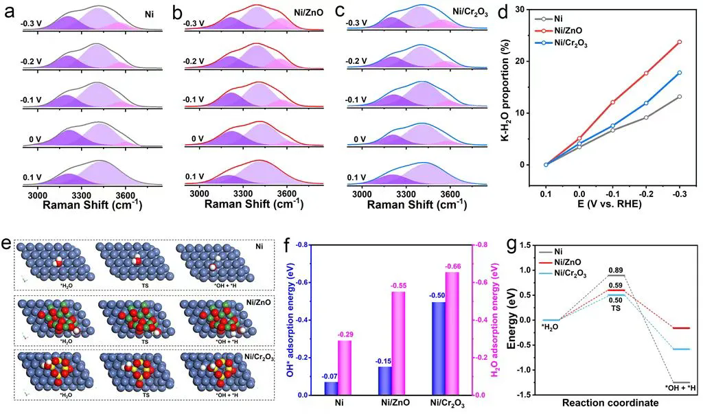 To further validate the enhanced HER kinetics of the Ni/ZnO catalyst resulting from its optimal *OH binding capability, mechanistic study was conducted through in situ spectroscopic characterization and DFT calculations. In situ Raman spectroscopy showed that Ni/ZnO exhibited a higher proportion of K·H2O, indicating it induced a more ordered interfacial water structure. DFT calculations demonstrated that due to its moderate *OH adsorption capability, Ni/ZnO not only promoted the water dissociation process but also avoided the difficult desorption caused by excessively strong *OH adsorption (e.g., as observed in the Ni/Cr2O3 catalyst). These results are consistent with the volcano plot trend, confirming that the moderate *OH binding capability of Ni/ZnO balances water dissociation and *OH desorption, achieving optimal HER activity.