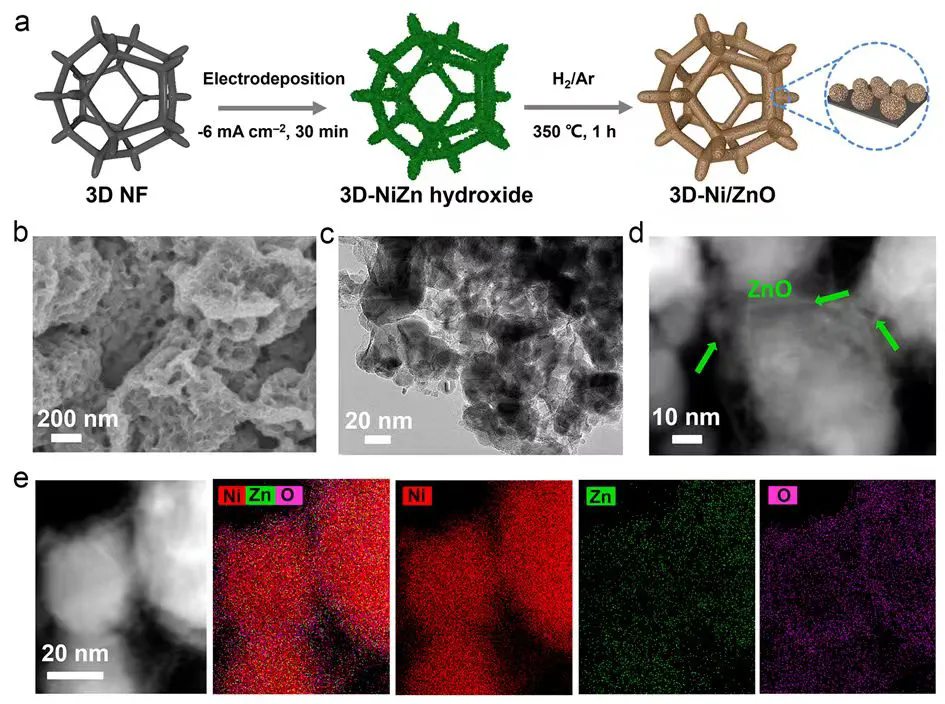 Based on the optimal active composition of Ni/ZnO, a heterostructure catalyst (3D-Ni/ZnO) was further constructed on a three-dimensional nickel foam substrate via an in situ electrodeposition method to expose more active sites and enhance HER performance. Electron microscopy characterization revealed that Ni/ZnO was uniformly loaded onto the nickel foam skeleton, with Ni nanoparticles encapsulated by ultrathin ZnO nanosheets. Additionally, this preparation method is suitable to fabricate large-area catalyst electrodes.