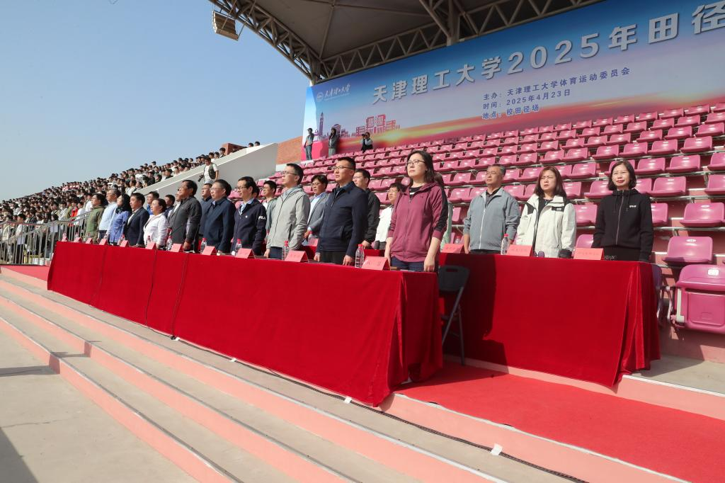 The 2025 Athletics Games of Tianjin University of Technology (TUT) opened at the university sports ground on April 23. The university’s senior leadership, including Liu Dongzhi, Lian Jijian, Xu Rui, Chen Shengyong, Wang Tie, Feng Hua, and Su Ronghua, attended the opening ceremony. The ceremony was presided over by Ye Ning, the Vice President and Member of the Standing Committee of the Party Committee. Members of the organizing committee and heads of various departments were seated on the rostrum.