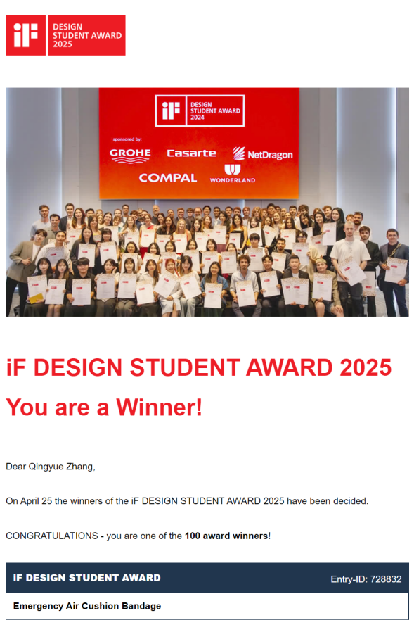 Guided jointly by Professor Zhong Lei and Associate Professor Zhang Yuequn from TUT School of Art & Design, graduate student Zhang Qingyue of the 2023 class in the art program designed the work “Emergency Air Cushion Bandage”, which stood out from over 7,000 entries from more than 72 countries worldwide and won the 2025 German IF Student Design Award.