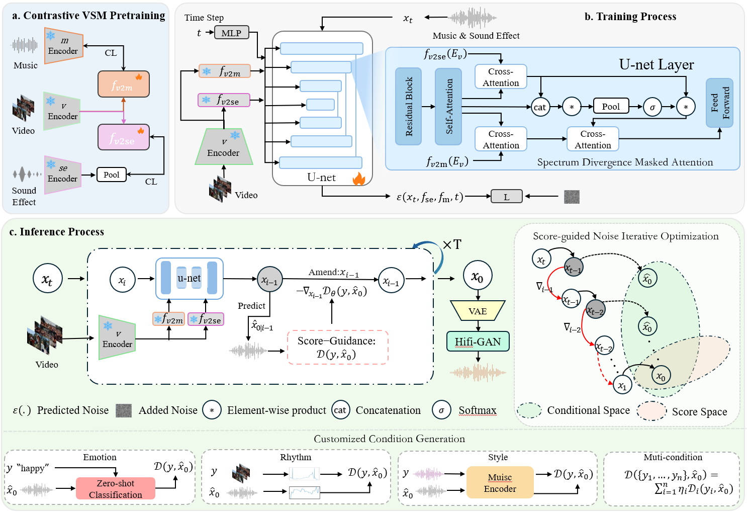 This paper was written by Associate Professor Fan Qi and her master's student Kunsheng Ma. This study conducts in-depth research on music and sound effects in the field of video music generation, and proposes an innovative video music diffusion model framework that utilizes spectral divergence mask attention and guided noise optimization. This framework integrates three core modules: visual sound music pre training, spectral divergence mask attention mechanism, and score guided noise iterative optimization, effectively mapping the modal information of music and sound effects to a unified feature space. Through this mechanism, the model significantly enhances its ability to capture complex audio dynamics while maintaining the unique characteristics of sound effects and music. In addition, even under the conditions of optimizing video music and without complex learning and training of video information, this method can still provide music creators with highly customizable control capabilities, making the music generation process more flexible and efficient.