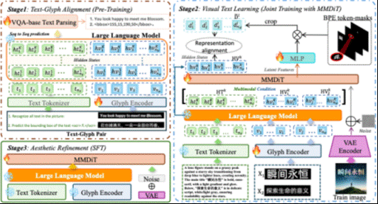 Summary: Current mainstream text-to-image (T2I) models still face three major challenges in visual text rendering: Lack of glyph-level understanding: Text encoders such as CLIP and T5 cannot perceive detailed character shapes and structures. Semantic–glyph confusion: Models often conflate “text to be rendered” with general semantic descriptions. Limited aesthetic quality: Generated images frequently suffer from poor integration of text with the background in terms of color, lighting, and perspective.
