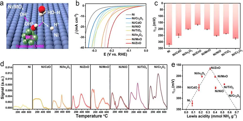 To address it, the team led by Prof. Tong-Bu Lu and Zi-You Yu first constructed a series of Ni/MOx heterostructures (M = Ti, Cr, Mn, Ni, Zn, Cd, or In) as model catalysts to investigate the influence of different metal oxides on the HER activity of nickel. The results revealed a volcano-type relationship between the HER activity of Ni/MOx catalysts and their Lewis acidity, suggesting that Lewis acidity can serve as an effective descriptor for HER activity under neutral conditions. Among them, Ni/ZnO with the moderate Lewis acidity yields optimal *OH binding, which balances water dissociation and *OH desorption kinetics for the best HER activity, following the Sabatier principle. Subsequently, Ni/ZnO was grown in situ on a conductive nickel foam substrate to fully expose active sites. The resulting catalyst required overpotentials of only 34 and 194 mV to achieve current densities of 10 and 200 mA cm⁻2, respectively, in a neutral electrolyte, significantly outperforming the Pt/C catalyst. Furthermore, it demonstrated stable operation for 2000 h at both 10 and 200 mA cm⁻2, ranking it among the best neutral HER catalysts reported to date.