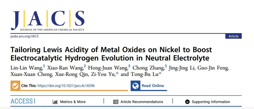 Recently, Professor Tong-Bu Lu's team from the Institute for New Energy Materials and Low Carbon Technologies at our university published their latest research progress on hydrogen production via water electrolysis under neutral pH conditions in top journal JACS.